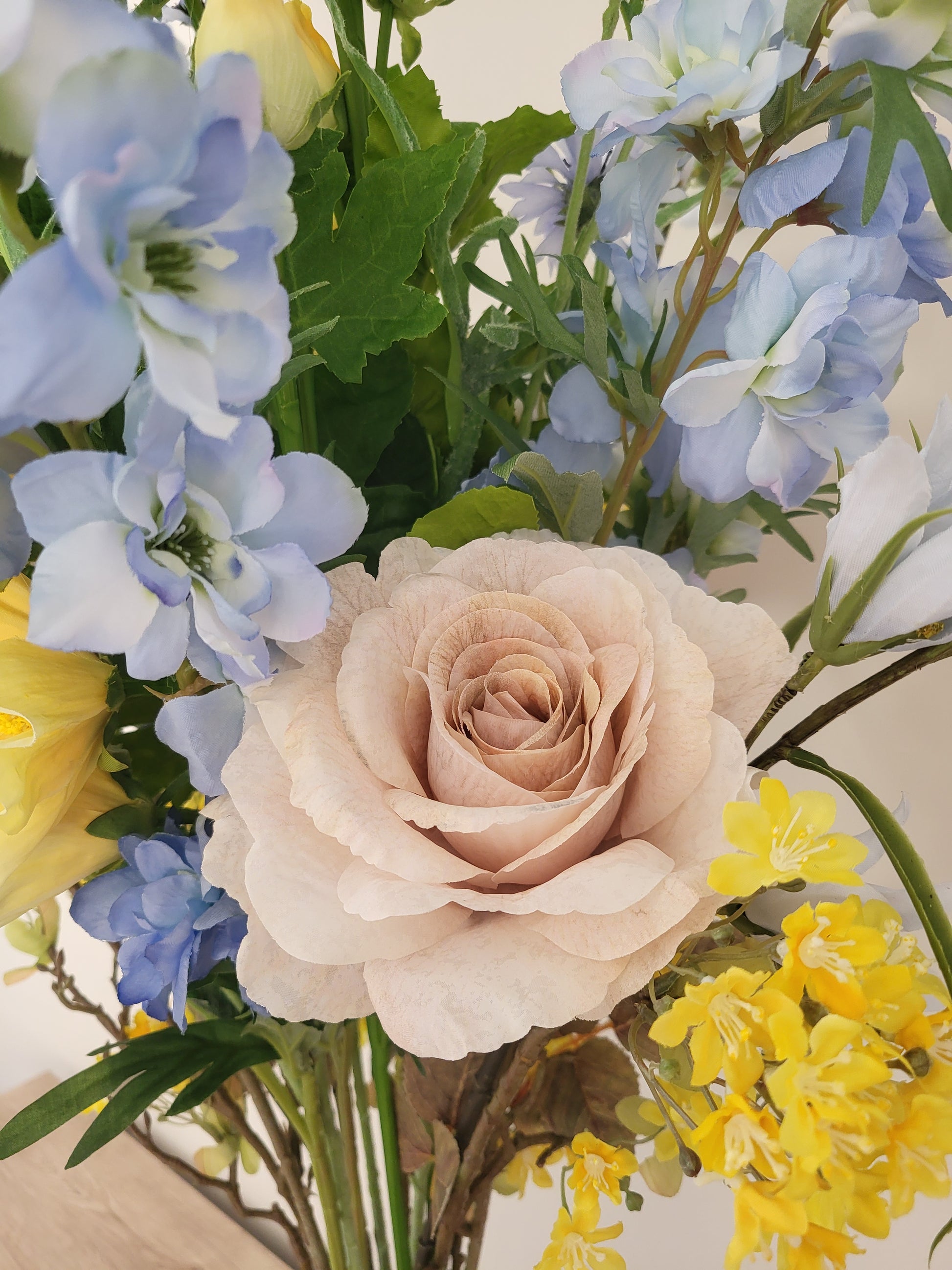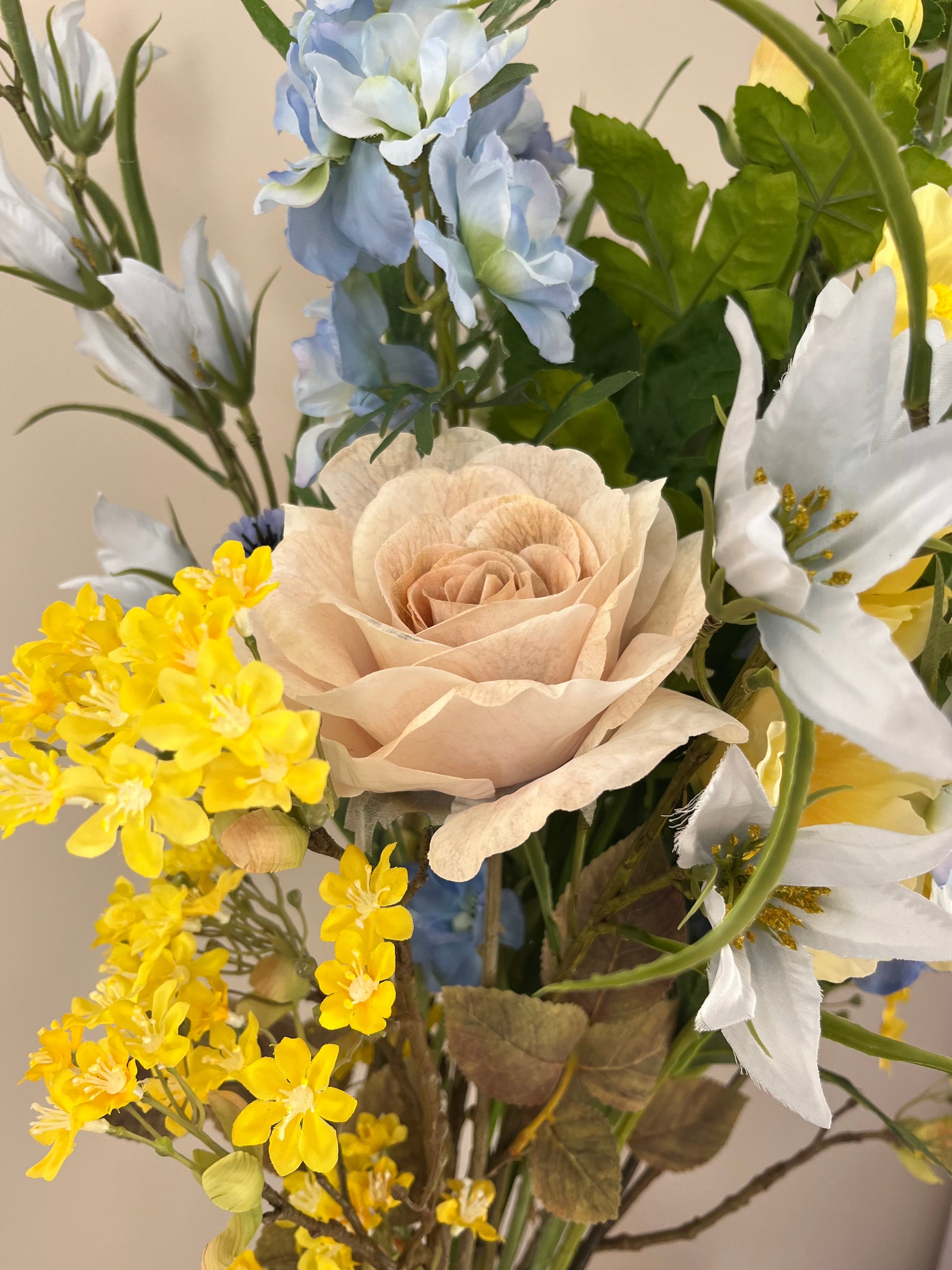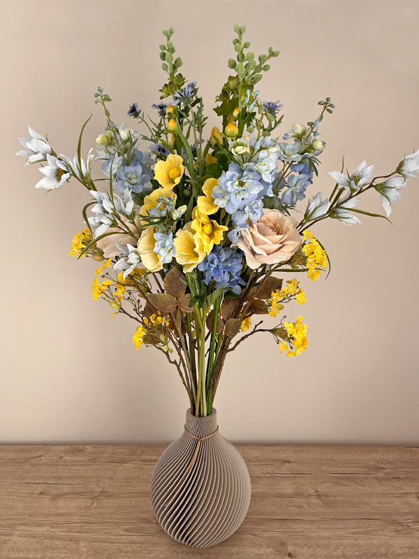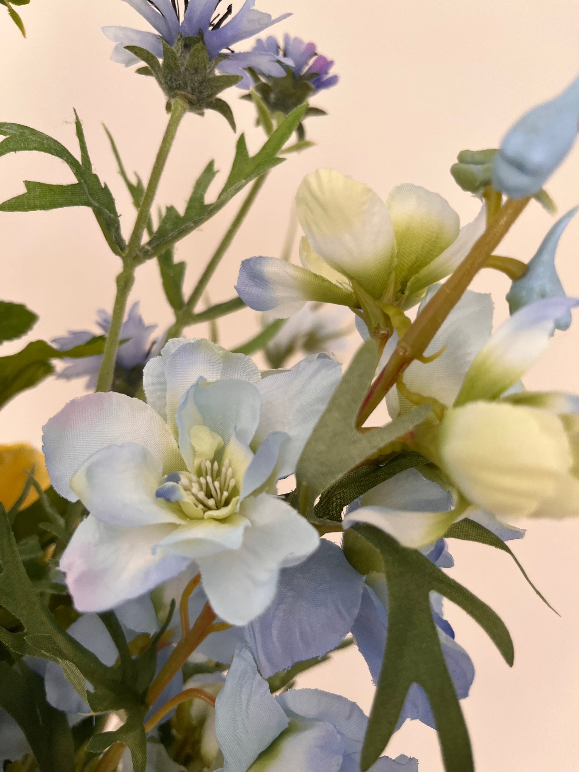 Breng de mediterrane sfeer in huis met dit stijlvolle zijdeboeket in een exclusieve design vaas. De zachte pasteltinten van blauw en crème worden prachtig gecombineerd met zonnig geel – een subtiele verwijzing naar de zee, het zand en de eindeloze zonnestralen van de Costa Blanca.