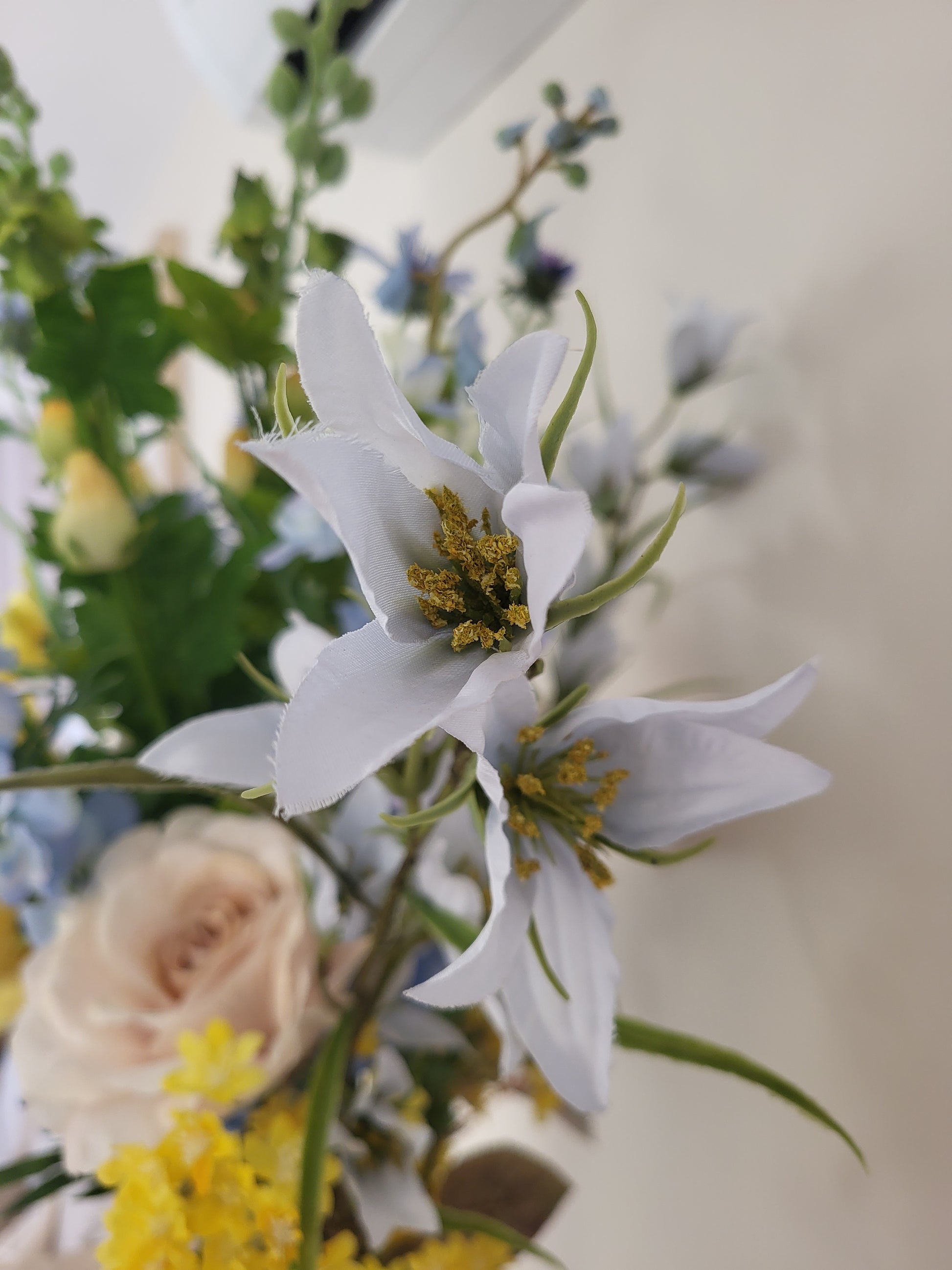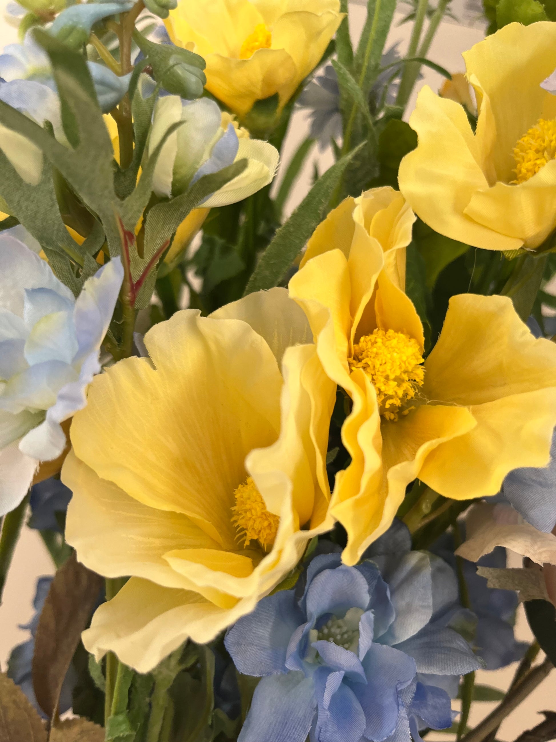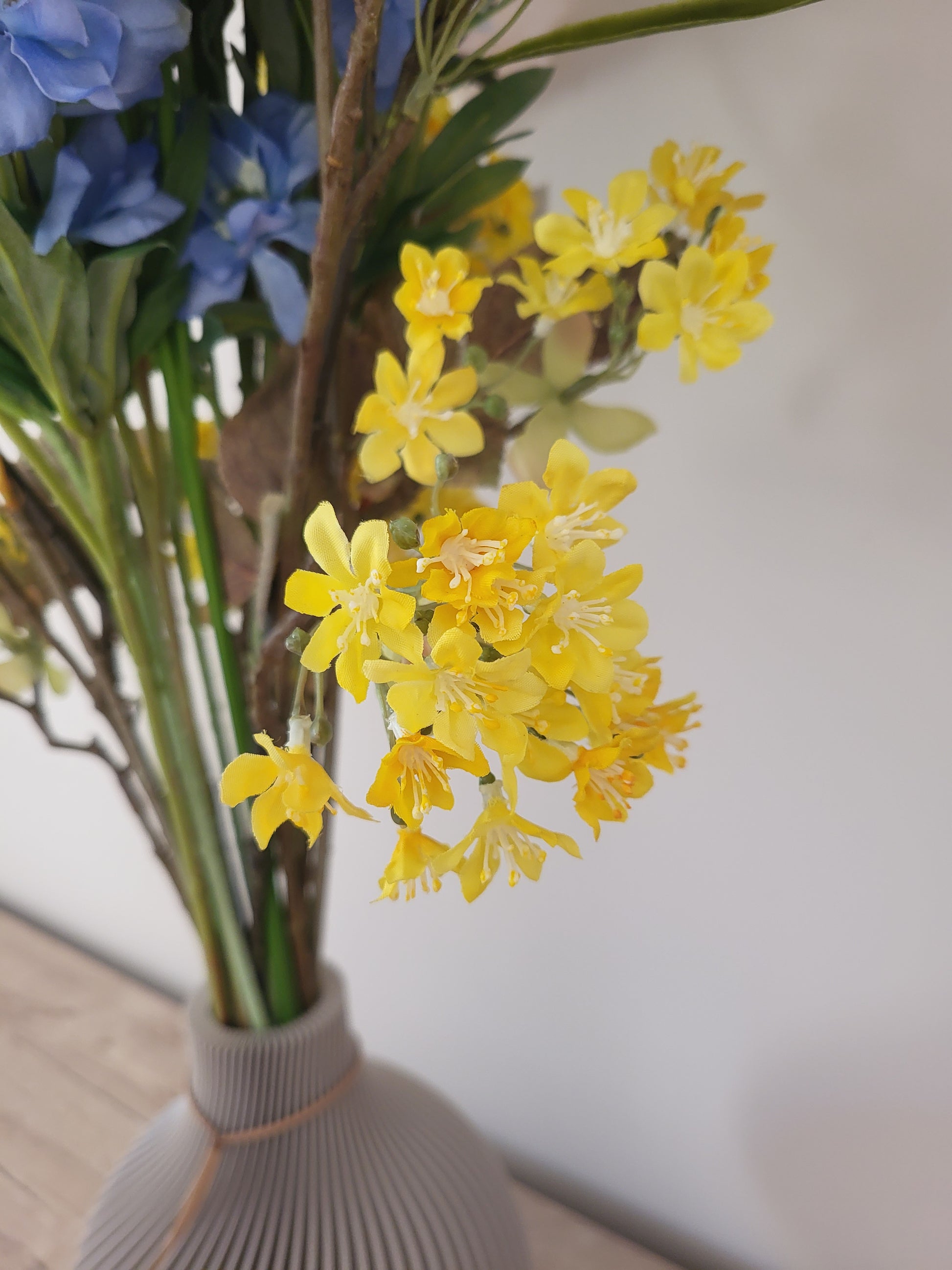 Breng de mediterrane sfeer in huis met dit stijlvolle zijdeboeket in een exclusieve design vaas. De zachte pasteltinten van blauw en crème worden prachtig gecombineerd met zonnig geel – een subtiele verwijzing naar de zee, het zand en de eindeloze zonnestralen van de Costa Blanca.