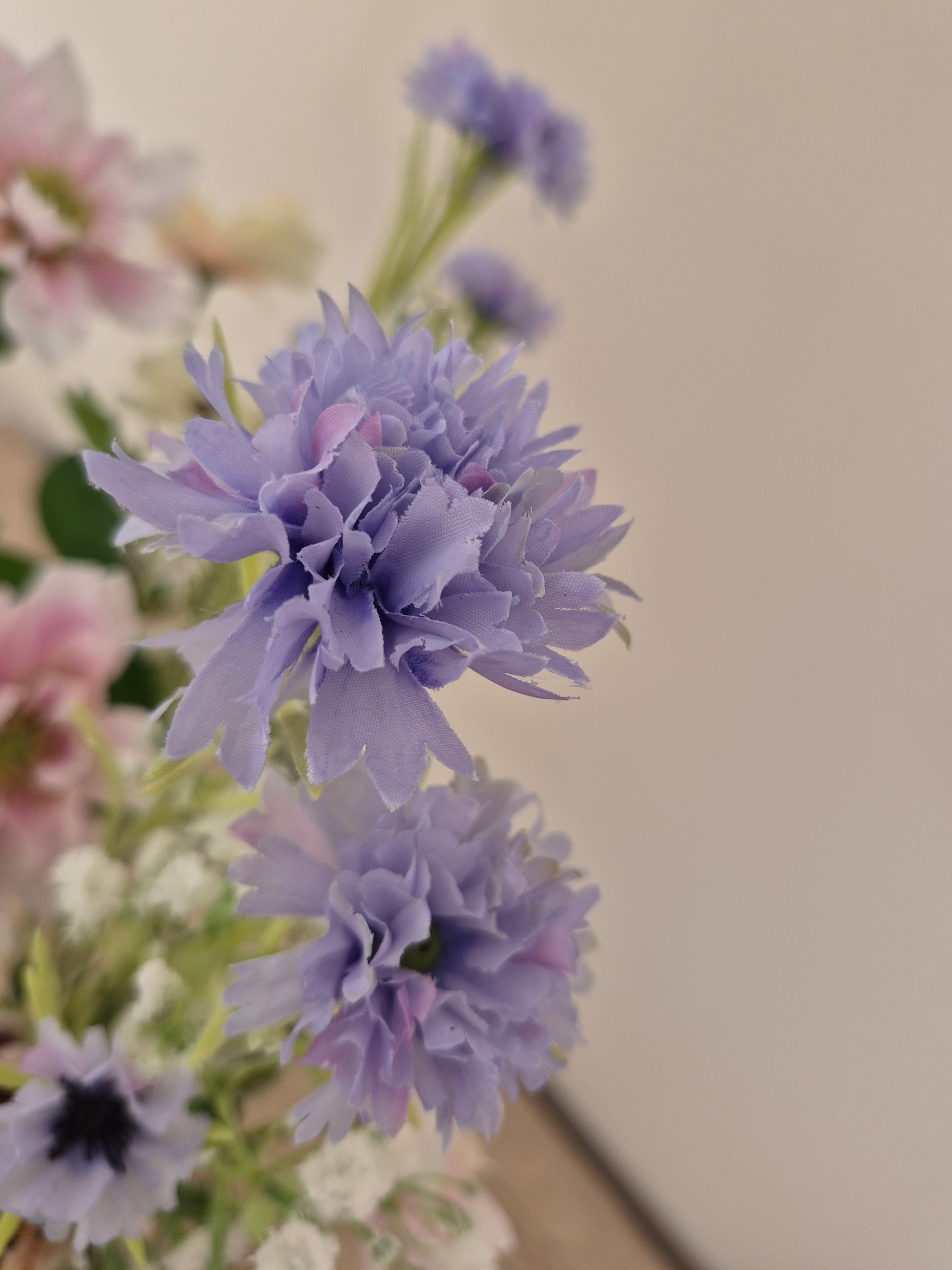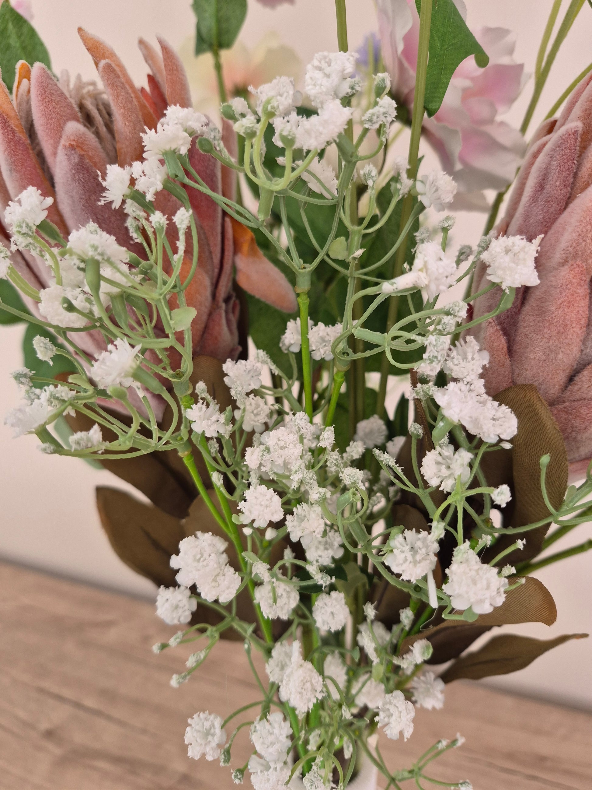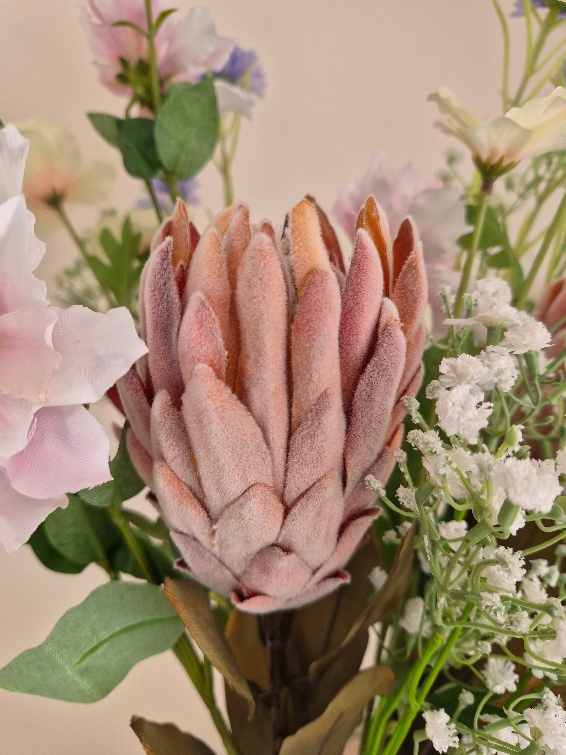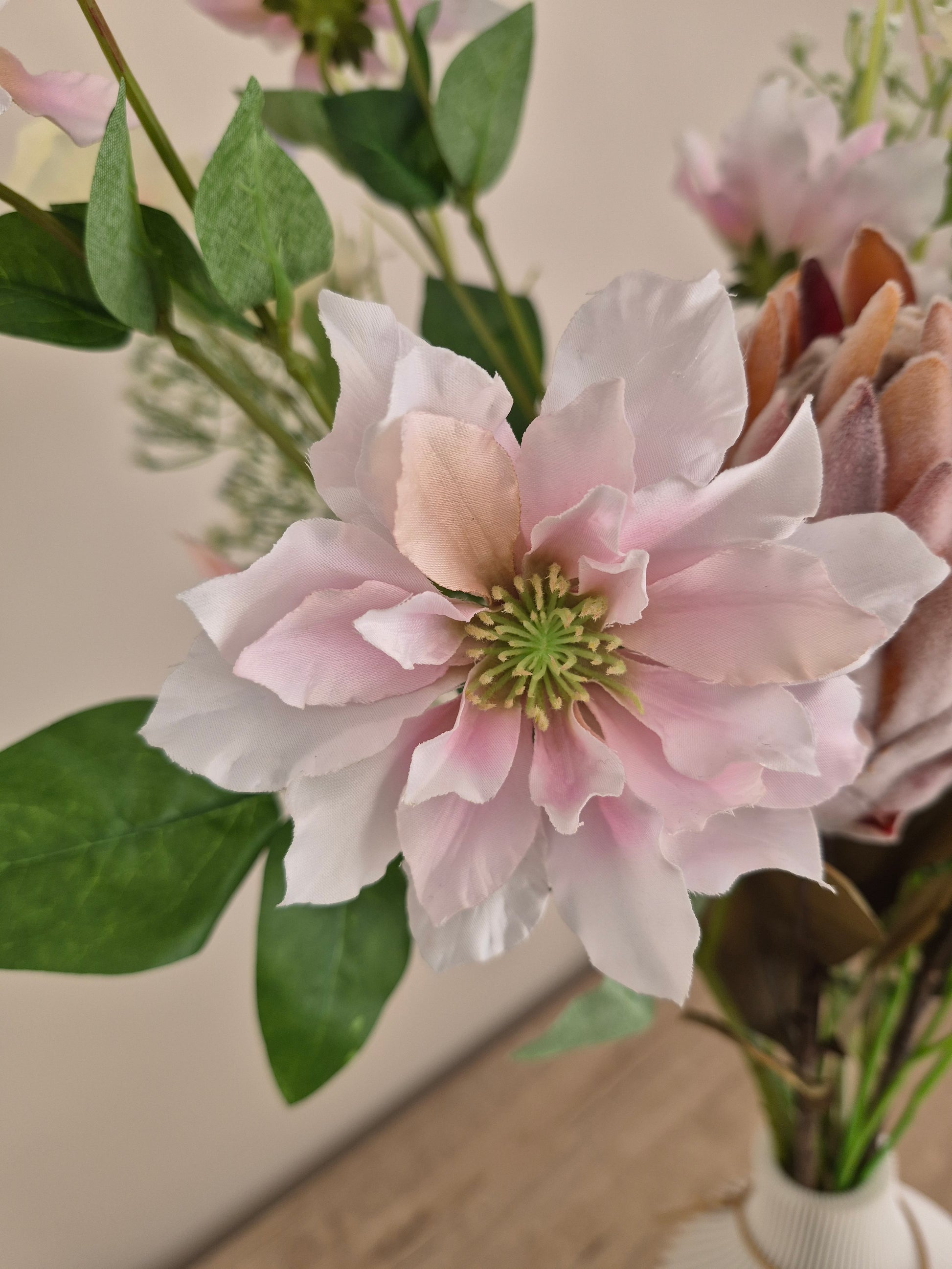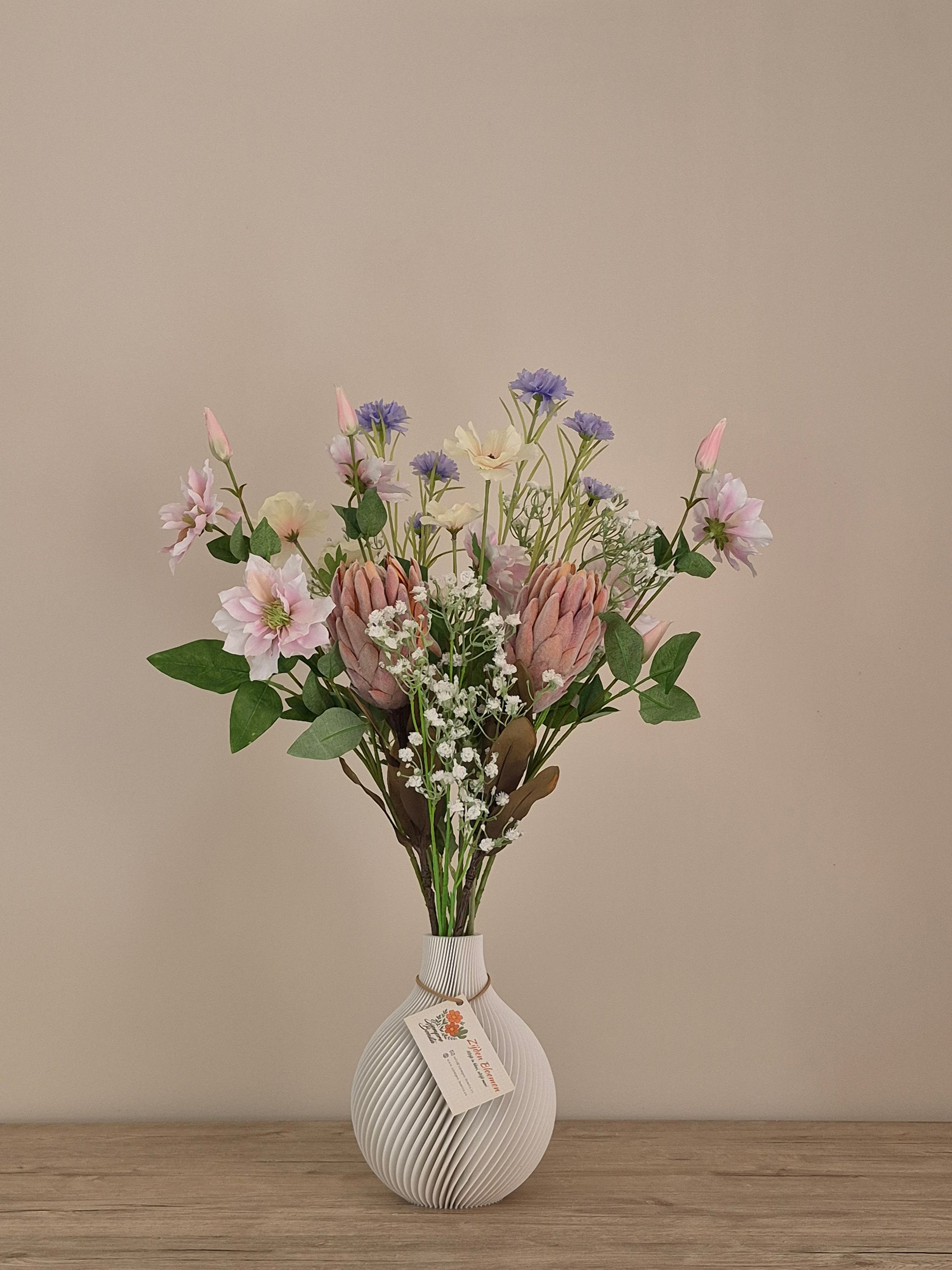 Costa Blush is een verfijnd zijden boeket met een zachte, mediterrane uitstraling. De combinatie van elegante protea, luchtig gipskruid, romantische clematis, speelse korenbloem en verfijnde ranonkel zorgt voor een natuurlijk en harmonieus geheel in warme blush- en natuurtinten.