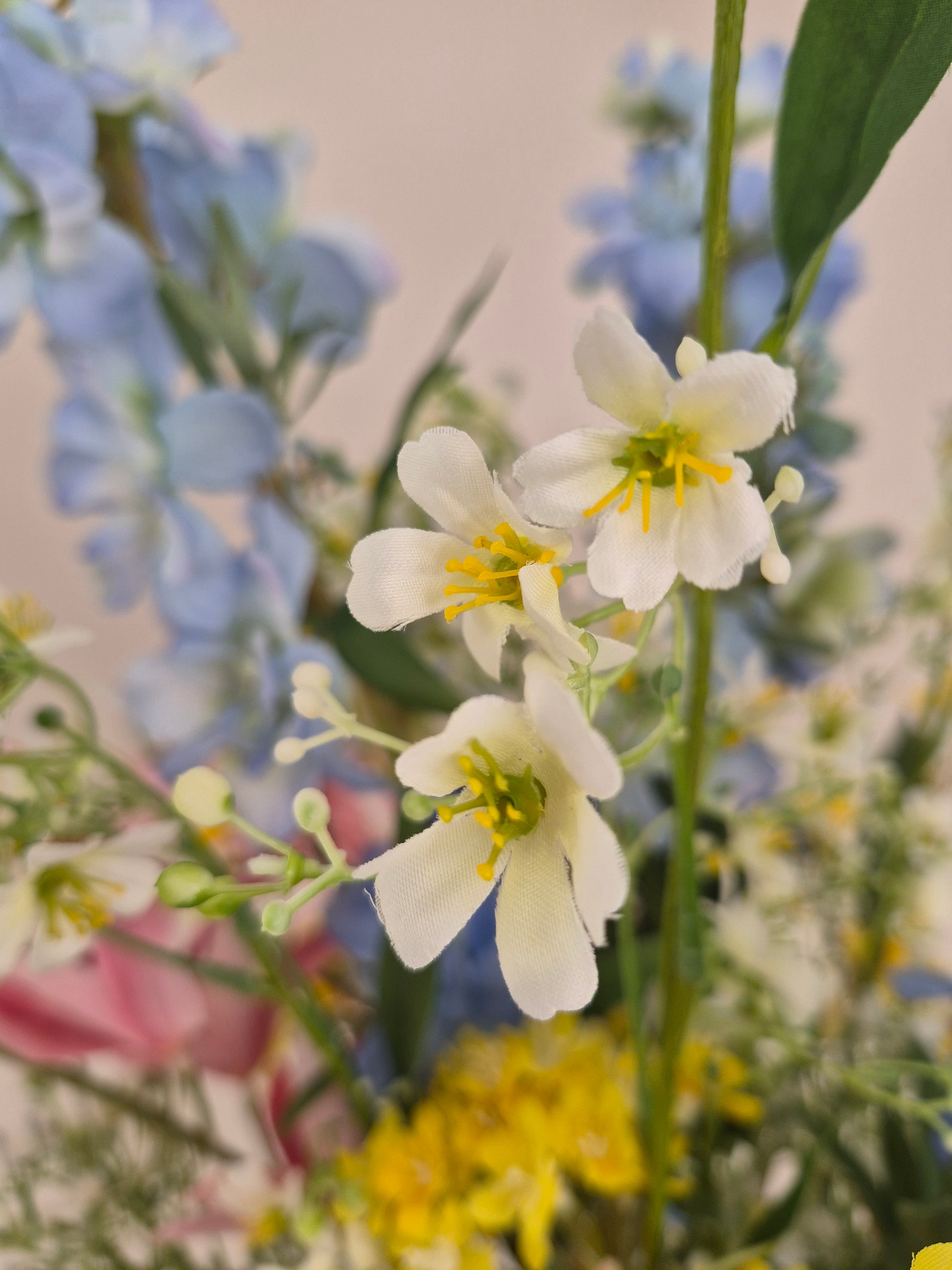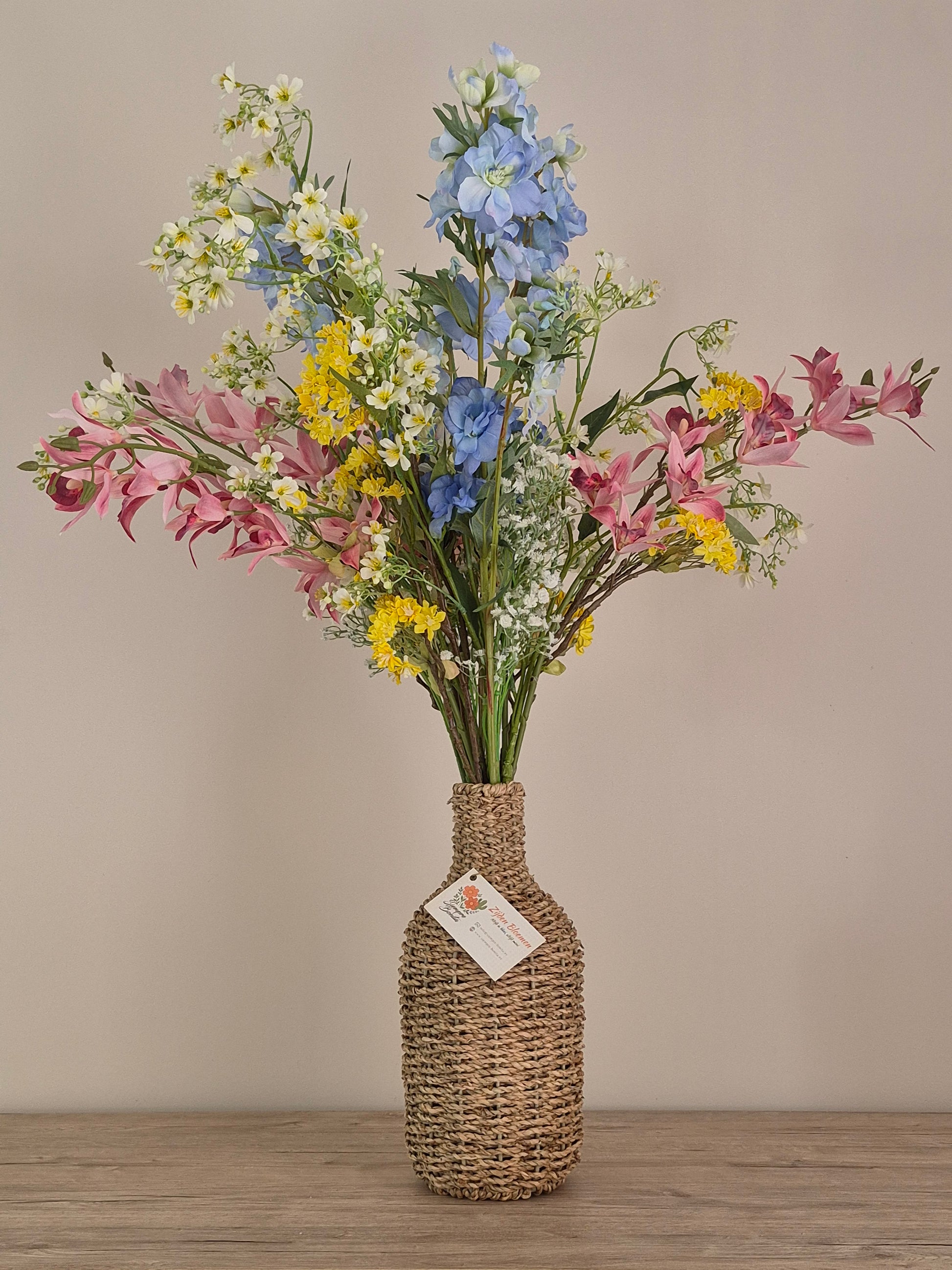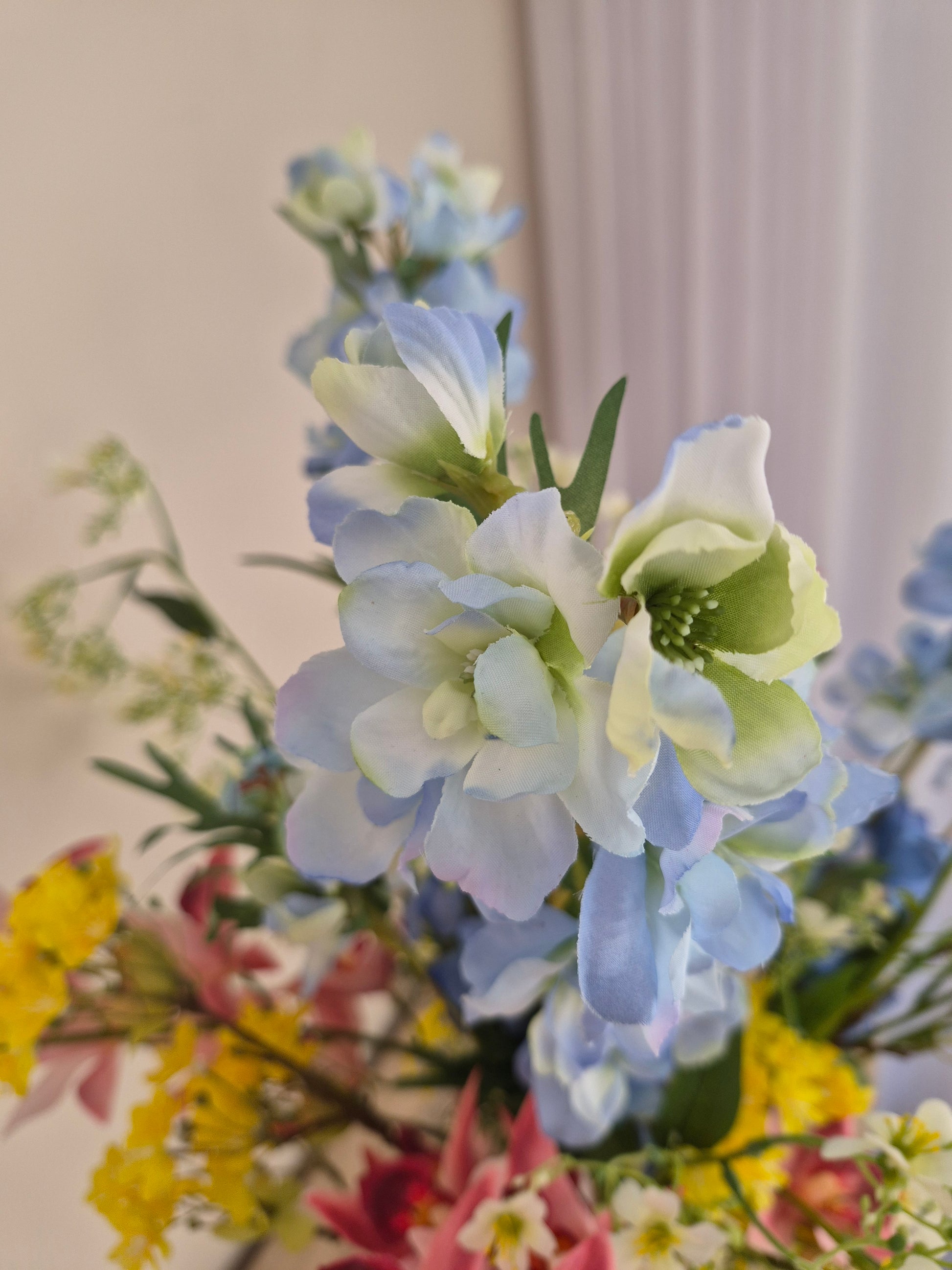 Dit prachtige zijden boeket brengt kleur, licht en levendigheid in huis. Het combineert frisse tinten met een speelse samenstelling die doet denken aan een lentetuin in volle bloei.