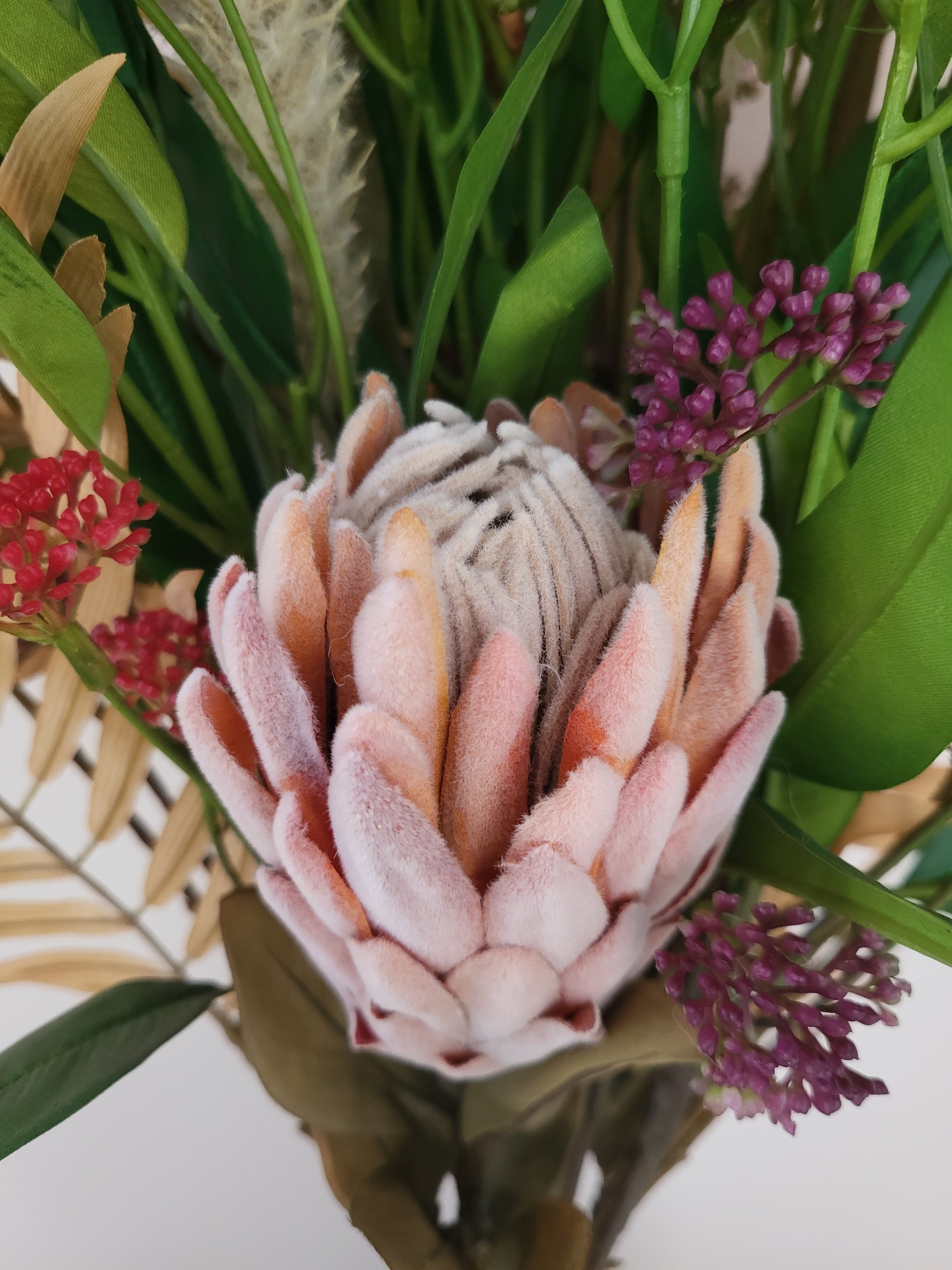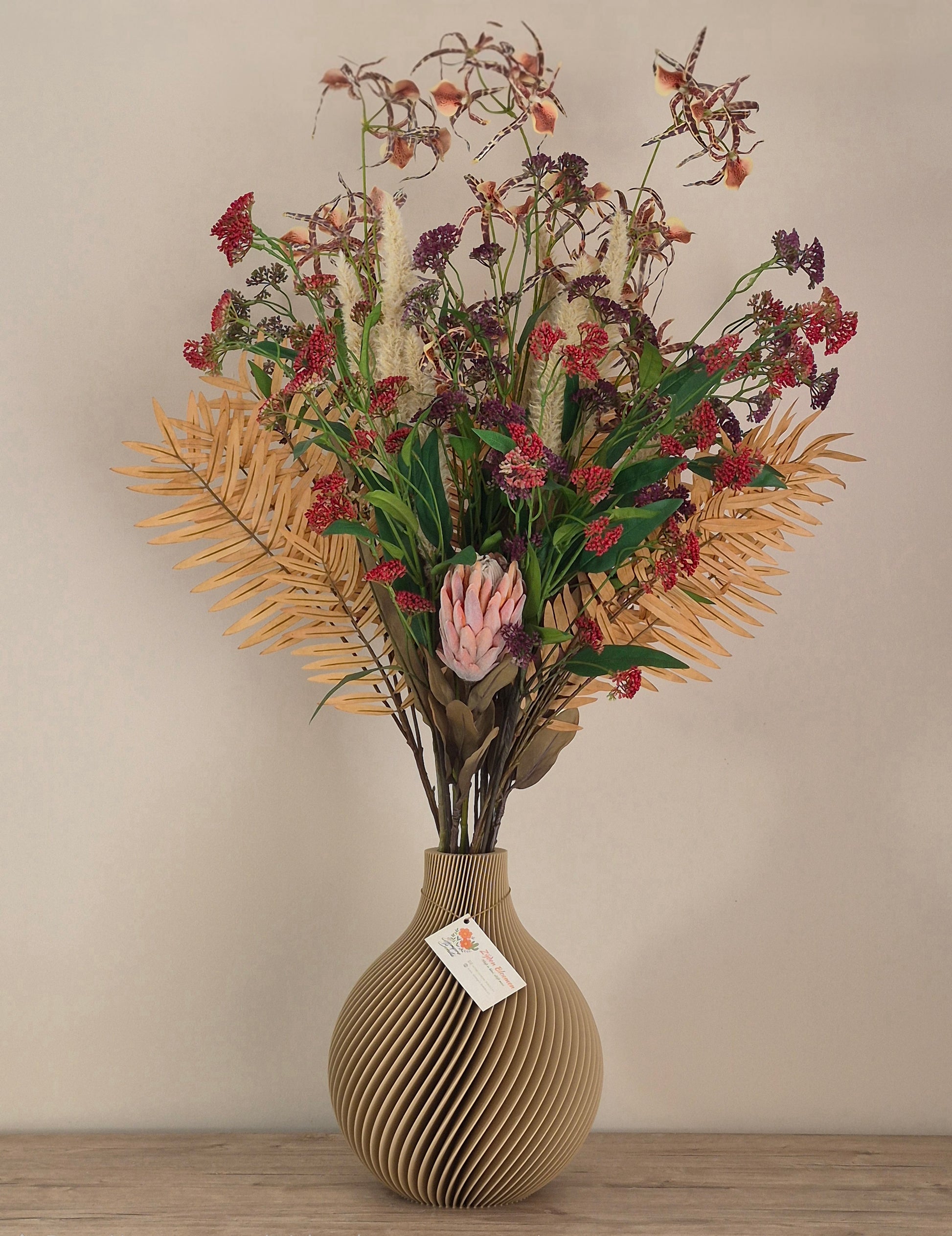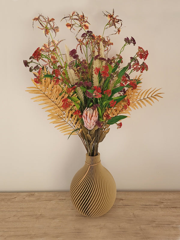 Breng de warmte van een mediterrane zonsondergang in huis met ons Golden Sunset boeket. De majestueuze protea vormt het hart van dit arrangement, omringd door sierlijke orchideeën, zachte pampaspluimen en gouden palmbladeren. Een stijlvol statementstuk in een unieke ribbelvaas dat perfect past in een modern of mediterraan interieur.