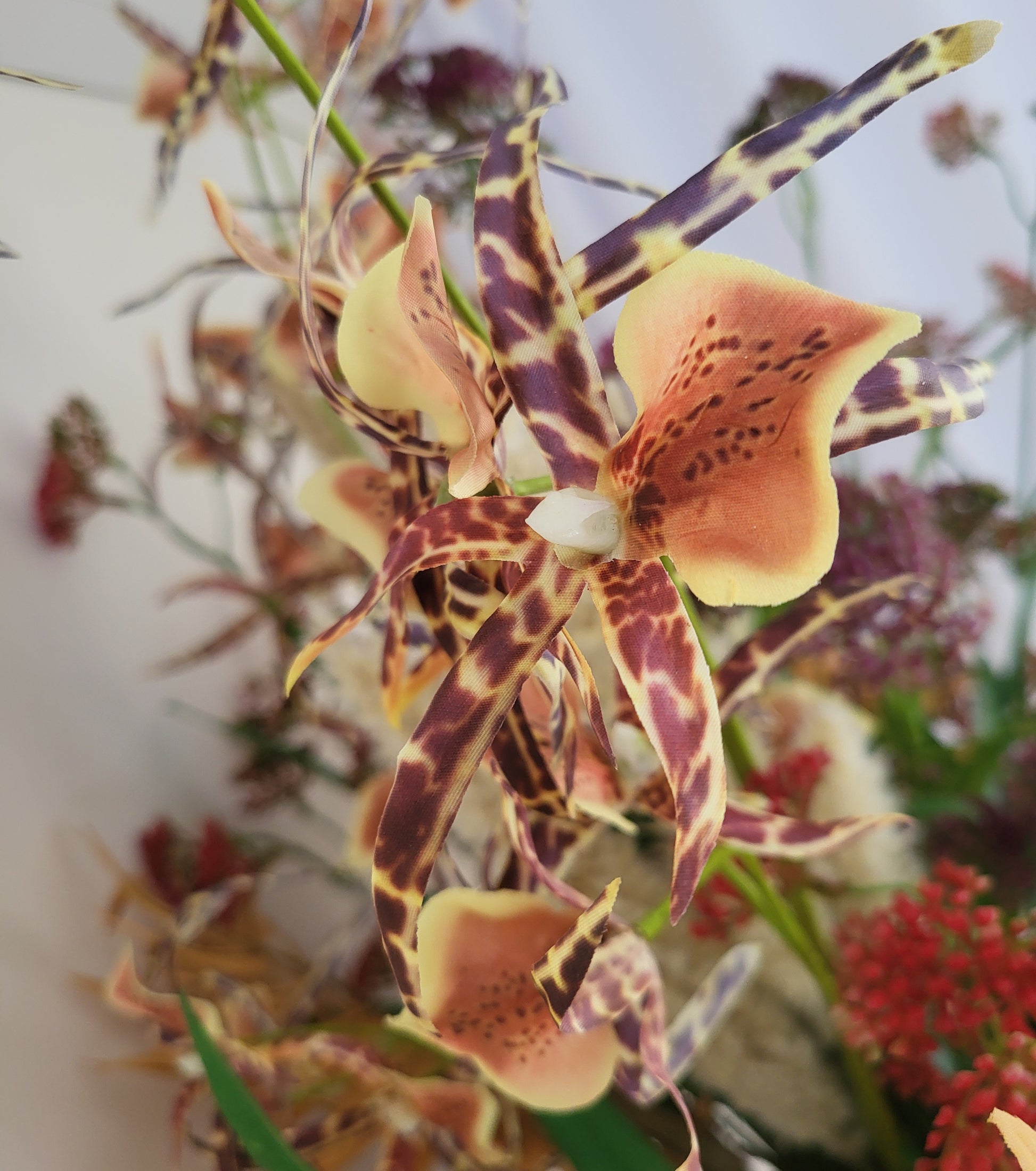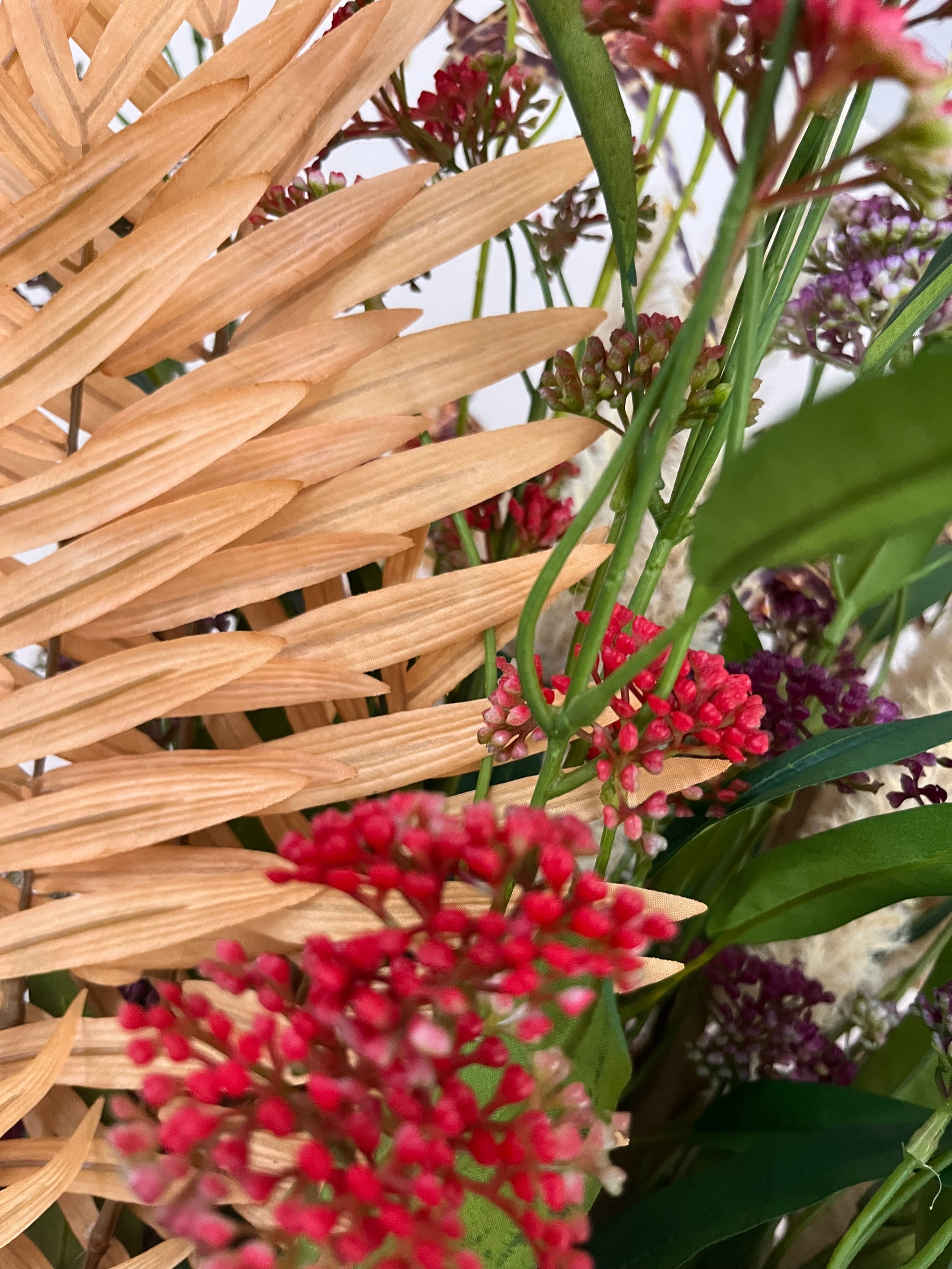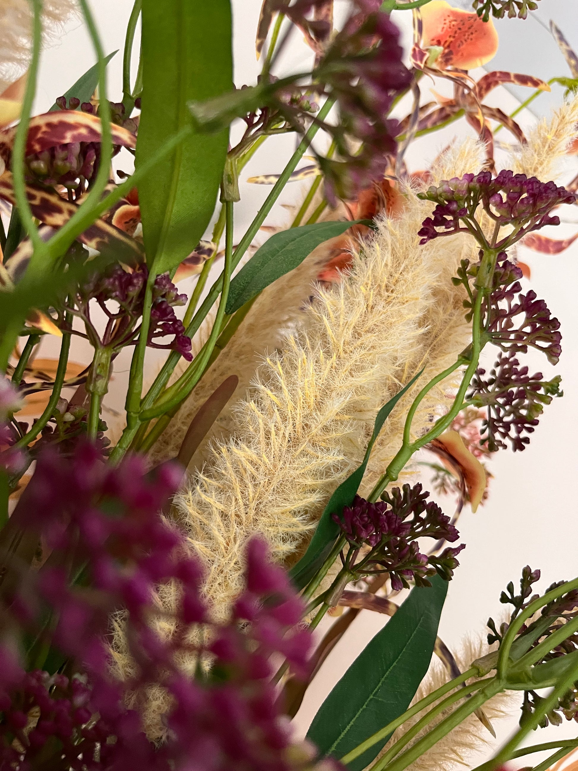 Breng de warmte van een mediterrane zonsondergang in huis met ons Golden Sunset boeket. De majestueuze protea vormt het hart van dit arrangement, omringd door sierlijke orchideeën, zachte pampaspluimen en gouden palmbladeren. Een stijlvol statementstuk in een unieke ribbelvaas dat perfect past in een modern of mediterraan interieur.
